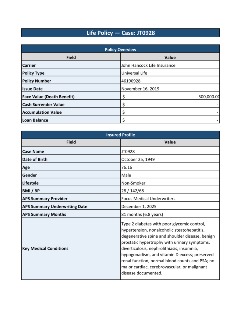 The insured, a 76-year-old male non-smoker, has documented medical conditions including type 2 diabetes with poor glycemic control, hypertension, nonalcoholic steatohepatitis, degenerative spine and shoulder disease, benign prostatic hypertrophy, diverticulosis, nephrolithiasis, and insomnia. These factors support actuarial assumptions and projected life expectancy, creating a data-driven foundation for predictable, strong returns.